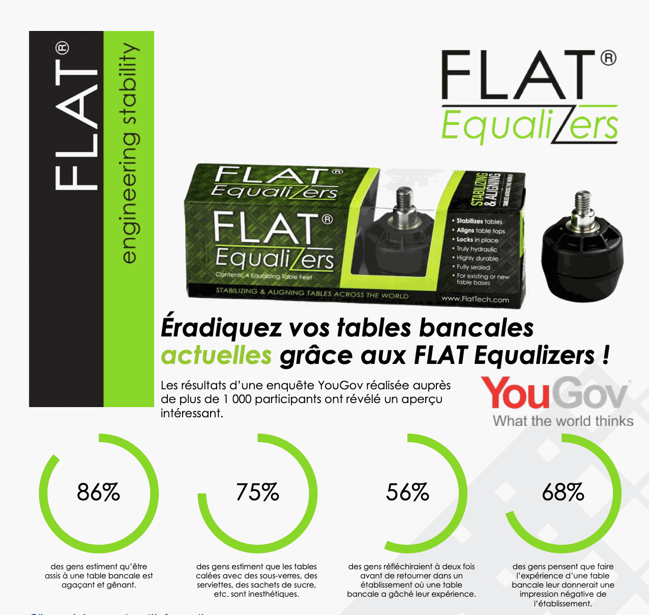 Les égaliseurs FLAT® sont une solution idéale pour les restaurateurs qui souhaitent stabiliser et aligner leurs tables existantes de manière rentable. Les égaliseurs remplacent les pieds vissés d'une table et stabilisent la table en exerçant une légère pression sur le plateau. , les Equalizers constituent une solution pratique.